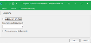 Dále je nutné dokumenty, které chceme schvalovat zařadit do kategorie výrobní dokumentace, která je ke schválení nastavena (externí atribut Vyžadovat přečtení) a má u sebe vyplněný atribut Expirace. Expirace určuje po jaké době ve dnech vyprší schválení a je vyžadováno nové schválení. Schvalovat lze i standardní externí dokumenty navázané k VP. Dokumenty musí být zařazeny do stromové struktury dokumentů a daná urověň musí mít stejná nastavení jako ke uvedeno na výrobní dokumentaci (Vyžadovat přečtení, Expirace)