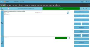 v prostřední levé části. Podle nastavení na pracovišti se zobrazí buď seznam operací přiřazených k pracovišti (fronta práce) nebo pole pro zadání čárového kódu. Při výběru z fronty práce lze použít fulltextové vyhledávaní v záhlaví okna nebo uživatelský filtr